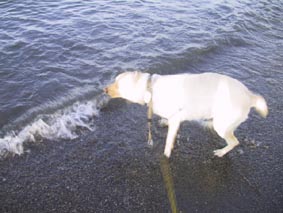 ビーは波の音が怖くて・・・。最後に夕日をバックに記念撮影! 疲れたビー!